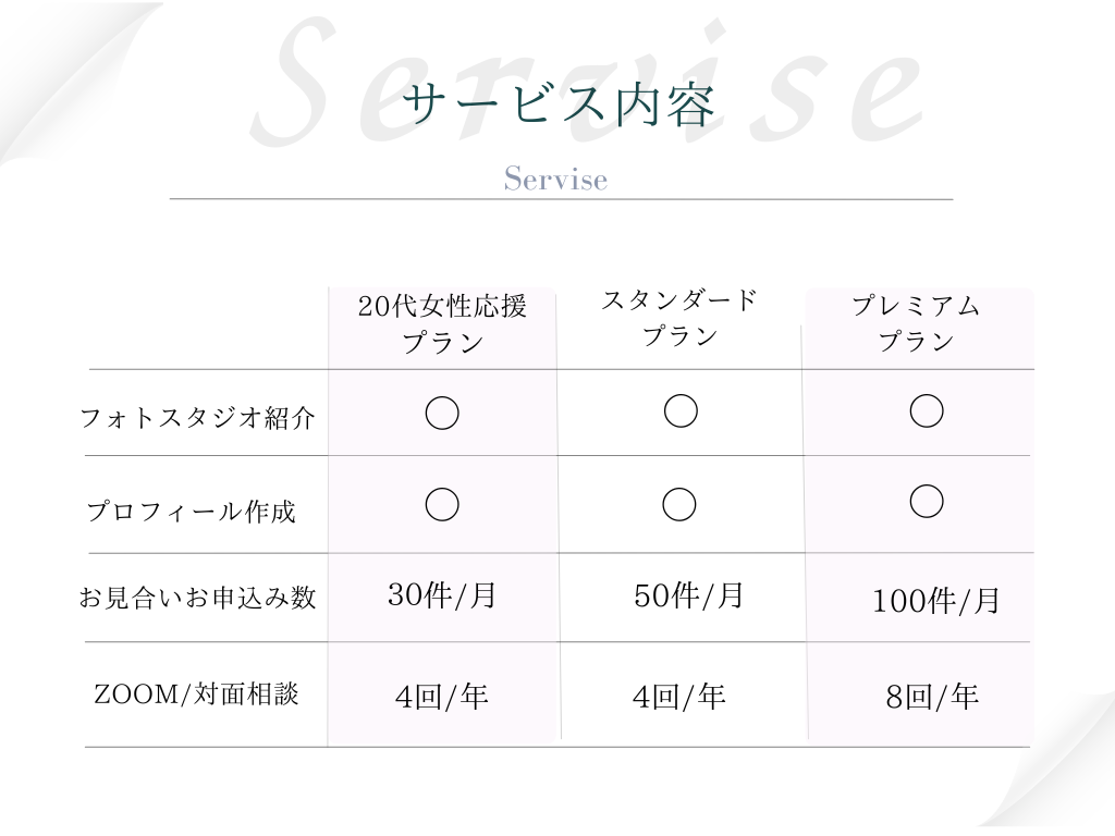 ★成婚料・・・成婚に至った際にお支払いいただく費用です。尚、結婚・婚約またはそれらと同等の成果(「結婚の口約束」「宿泊を伴う旅行」「婚前交渉」「同棲生活」)などは成婚とみなします。